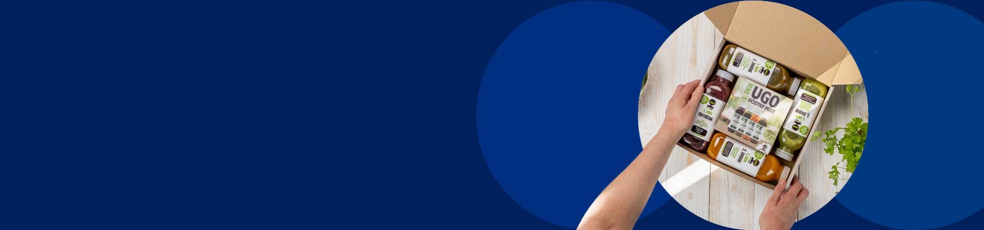 Unser Kunde Ugo startete sein Unternehmen mit Saftbars, die frische, vitaminreiche Getränke und gesunde Mahlzeiten anboten. In den letzten Jahren hat sich das Unternehmen erfolgreich in den Einzelhandel und zuletzt auch in den Online-Verkauf weiterentwickelt. Für den E-Commerce suchte unser Kunde nach einer E-Commerce-Verpackung, die die Produkte ansprechend präsentiert und gleichzeitig den Raum im Versand besser nutzt – denn die bisherige Verpackung war diesbezüglich nicht effizient genug.