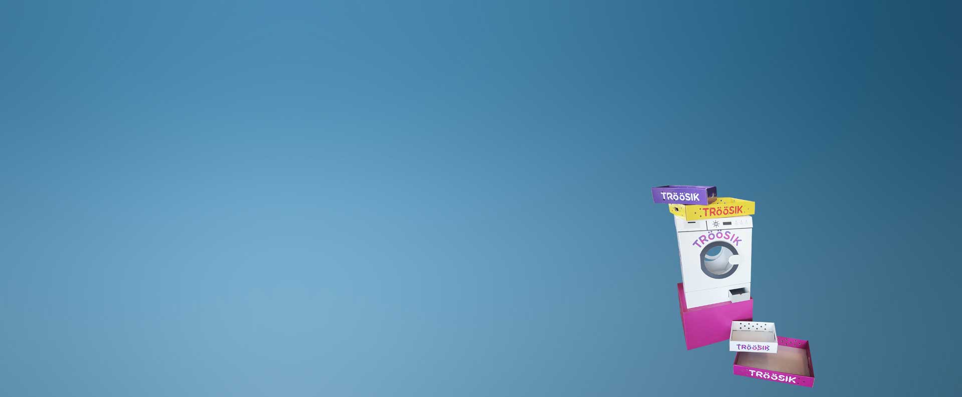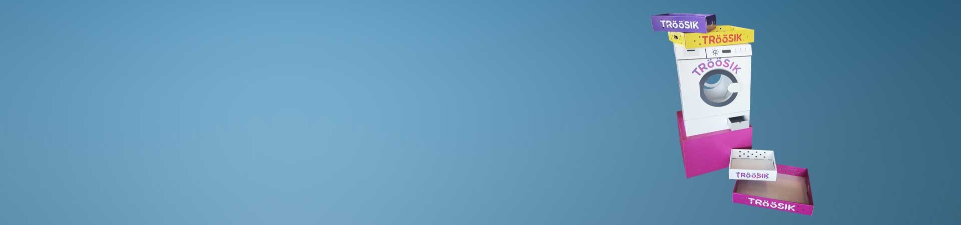 Las gomas 'Troosik' tienen forma de ropa interior, por esto diseñamos ¡lavadoras! como 'displays' del nuevo producto para reflejar el empaque principal. Una idea única que hizo que los productos se destacaran en las tiendas. Todos los 'displays' se fabricaron con material 100% reciclable, biodegradable y renovable a base de papel.
