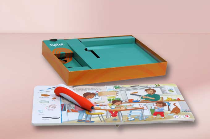 Et førende tysk firma inden for spil, puslespil og legetøj står bag TioToi brandet – et interaktivt pen- og bogsæt, der kombinerer leg og læring ved hjælp af moderne teknologi. Emballagen indeholdt tidligere en plastikindsats til at holde komponenterne på plads, men Ravnsburger ønskede at finde et mere bæredygtigt alternativ.