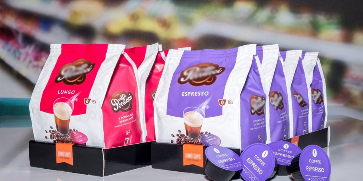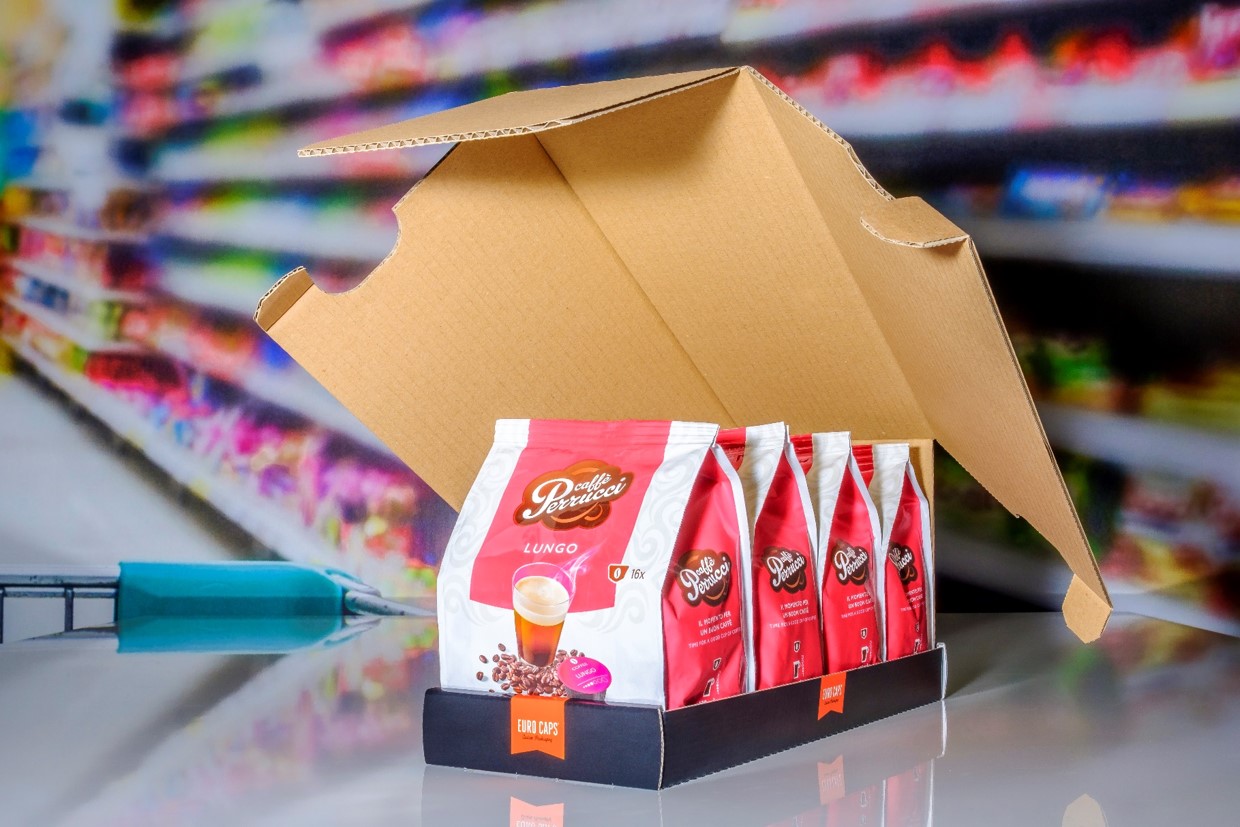 Een Shelf Ready Packaging (SRP) zonder zichtbare perforaties, waarbij de deksel het volledige gewicht draagt. Door de verbinding, zonder lijm of tape, tussen de deksel en de tray kan de SRP, bij het distributiecentrum opgetild worden door een automatisch vacuümtransport systeem.