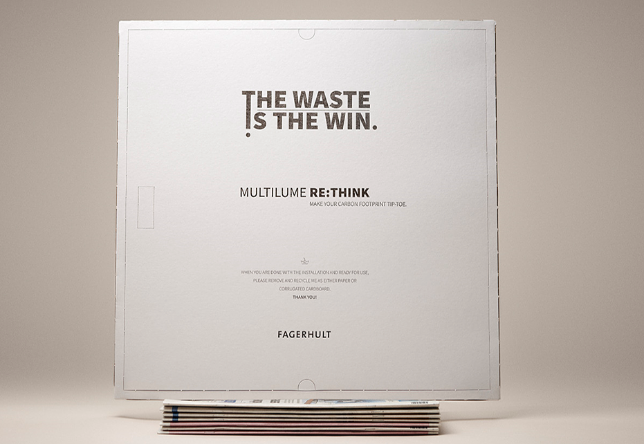 For det svenske belysningsselskapet Fagerhult har stålplater og plast tradisjonelt vært selskapets fremste materialer til armaturer, men nå har selskapets største produkt Multilume - en populær armatur i offentlige miljøer – fått en armatur i massivpapp og passende nok blitt døpt til Re:Think..