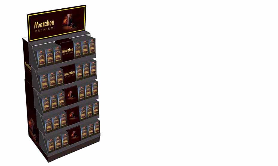 Oppdateringen av det internasjonale næringsmiddelkonsernet Mondelez sin butikkdisplay for Marabous mørke premium sjokolade løser et antall utfordringer. Transportemballasjen sparer plass under transport og kan brukes til den ferdige displayen, som er enkel å montere og som dessuten rommer flere sjokoladeplater enn tidligere.