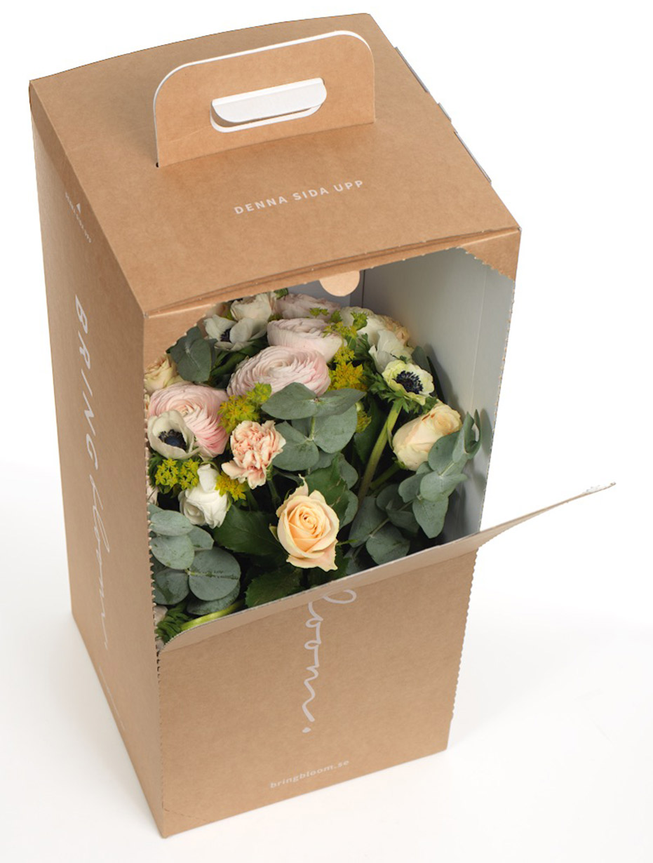 Blommor brukar traditionellt levereras till dörren insvepta i papper. Men utmanaren Bringbloom har valt en premiumförpackning i returfiberbaserad wellpapp med den vita företagslogotypen i offsettryck och en stansad lucka för att man enkelt ska kunna öppna förpackningen vid mottagandet.