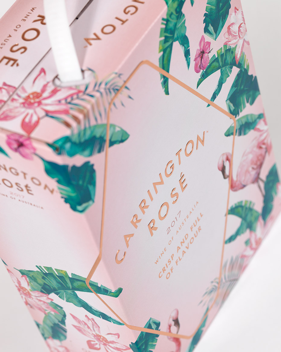 Pernod Ricards nya box för rosévinet Carrington Rosé har fått en »extra allt«-förpackning med rosafärgad metallfoliering, prägling och design med flamingos som definitivt sticker ut i vinhyllan.