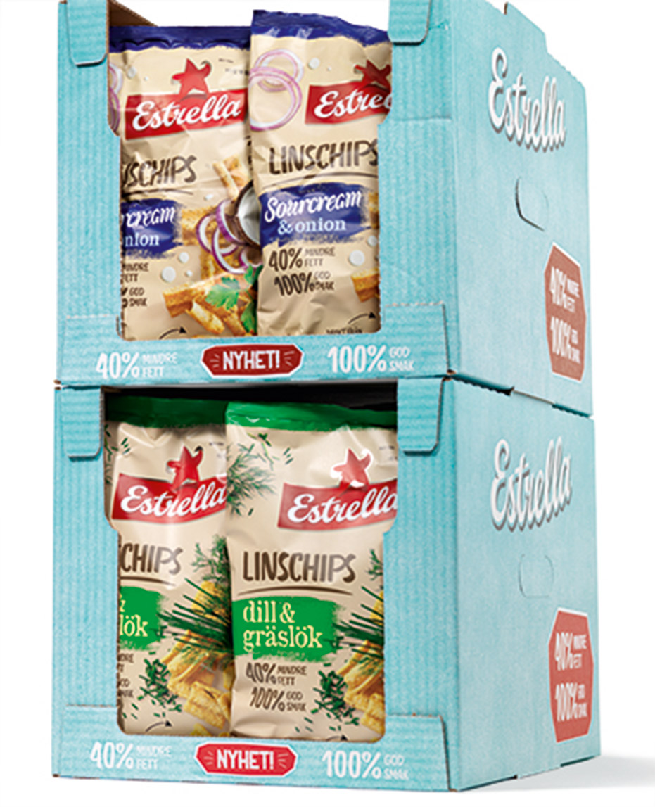 Genom att vara såväl veganska som glutenfria, innehålla 40 % mindre fett och 13 % protein lanserades Estrella Linschips som något av en nischprodukt i början av 2017. Och för att så många butiker som möjligt skulle välja att ta in den beslöt man att halvera den kombinerade transport- och displaylådan jämfört med den traditionella storleken för chipslådor.