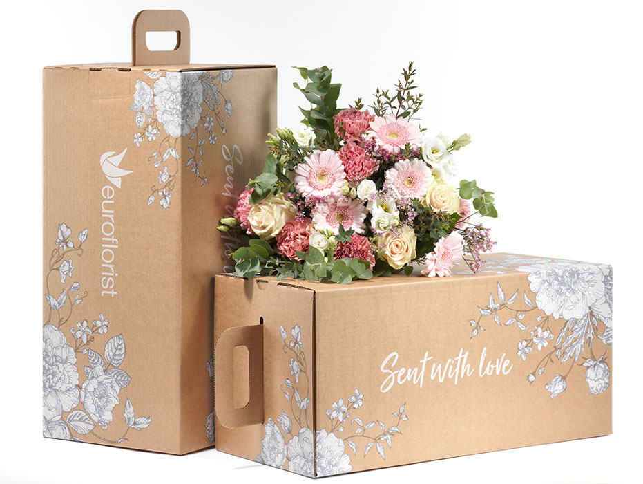 Smurfit Kappa fick även uppdraget att ta fram ett designförslag med Euroflorists logotyp, payoffen ”Sent with love” och en svartvit blomsterdekor. Kort sagt, en högst funktionell och ekonomisk lösning i lyxförpackning. Vem vill du själv överraska?