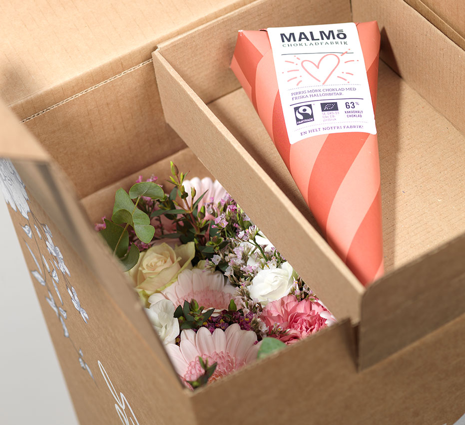 En annan intressant detalj som förbättrades under förpackningsarbetet var en liten avsats, där små bonuspresenter i form av choklad eller annat kan läggas som komplement till blommorna. Med Smurfit Kappas förslag kunde detta utrymme fixeras och placeras högst upp i förpackningen.