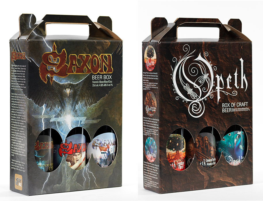 Allt förpackat i en solidpapp-låda med QR-koder till respektive Saxon-album, handtag, stansning som visar de tre öletiketterna och flexotryck från Smurfit Kappa. Och steget dit var inte alltför långt. Heavy Metale-delägaren Johan Öberg är nämligen anställd på förpackningsföretaget.